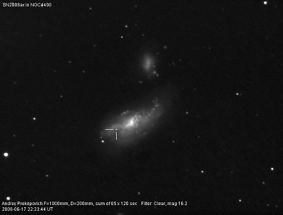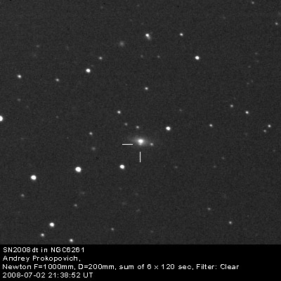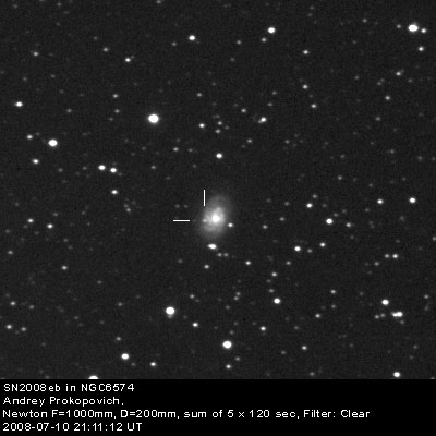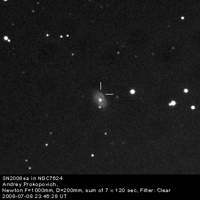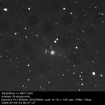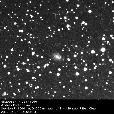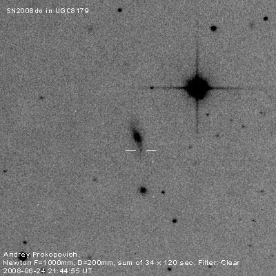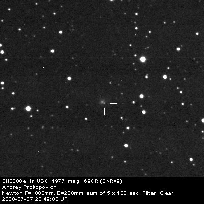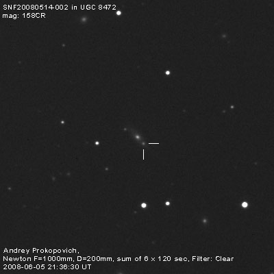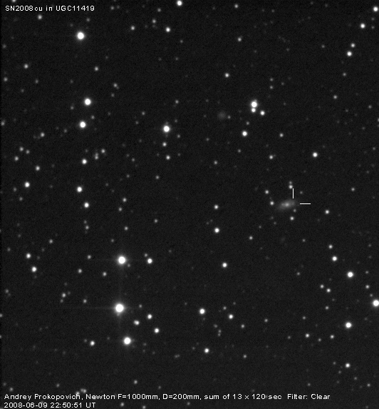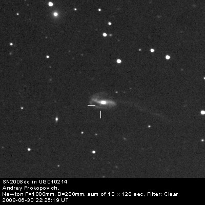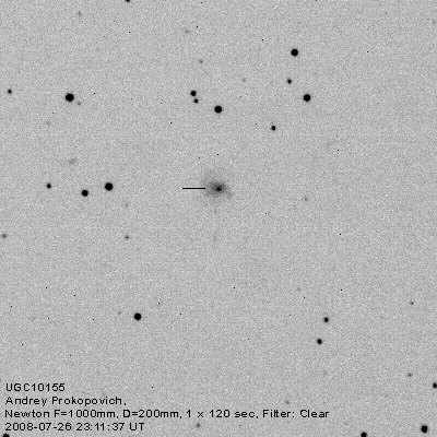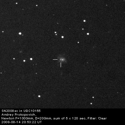 Сверхновую SN2008ev в UGC10155 открыл в 16-дюймовый телескоп Даг Рич 9 августа 2008 года. Для меня она интересна тем, что накануне вспышки я ее снимал в свой 8-дюймовый ньютон и эта галактика была в списке программы поиска. И вполне вероятно, что я снимал бы эту галактику 7-8 августа того года, но было облачно.